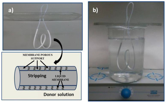 The donor phase consisted of 500 mL of aqueous solution at different trace concentrations ranging from 0.1 to 2.5 mg L−1 with an ionic strength adjusted to 0.1 M with NaNO3. The liquid membrane consisted of an organic solution of D2EHPA in dodecane at different concentrations: 0.1, 0.25 and 0.5 M impregnated in the pores of a microporous tubular fiber (Figure 1a). The impregnation was carried out by soaking the 30 cm long fiber with the organic solution with the help of a syringe. Once impregnated, the excess of the organic phase was eliminated by immersing the fiber in ultrapure water. The stripping phase, composed of either 500 or 600 μL of aqueous acidic solutions, was introduced with a syringe into the lumen of the fiber once the impregnated fiber was immersed in 500 mL of the donor solution containing the metal ion. This solution was continuously agitated at 200 rpm (Figure 1b). When the experiment was completed, the stripping phase was aspirated with a syringe from the lumen of the fiber and was diluted with ultrapure water until 1 or 2 mL before being analyzed by ICP-OES. Two sets of six standard solutions were prepared to build the calibration curves for the determination of Zn. The first set ranged from 0.01 to 2.5 mg L−1 of Zn(II) in NaNO3 aqueous media and was employed for the metal determination in the donor solution. The second set, ranging from 20 to 250 mg L−1 of Zn(II), was prepared in the same media as the stripping solutions. When other metals such as Cu and Fe were present in the donor and stripping solutions, their concentrations were also determined by ICP-OES and the calibration standards were prepared following the same procedure as in the case of Zn. All experiments were carried out at ambient temperature (22 ± 1 °C).