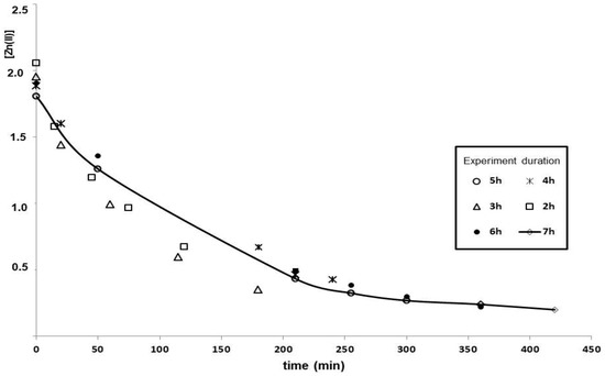 As can be seen in Figure 2, equilibrium was achieved after 7 h under the tested conditions. The main part of the depletion in the Zn(II) concentration took place in the first 4 h (~82%) and ~10% in the final 2 h. Hence, the duration of later experiments was set at 7 h.