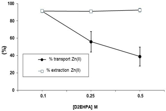 Effect of the D2EPHA concentration on the extraction and transport of Zn (n = 3). [Zn(II)] = 2 mg L−1 in 0.1 M NaNO3. Stripping phase: 600 µL of 0.1 M HNO3.