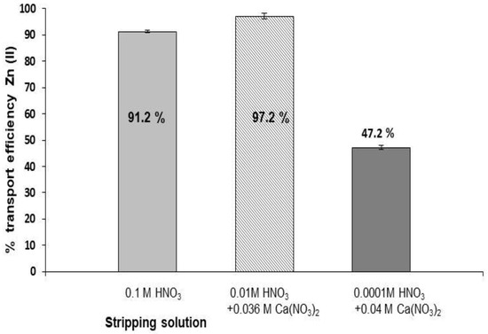 The effect of the composition of the stripping phase was studied by conducting transport experiments with different compositions, such as a 0.1 M HNO3 solution and solutions containing both HNO3 and Ca(NO3)2 at different concentrations and maintaining the ionic strength at 0.1 M. The use of acidic solutions was intended to facilitate the cation exchange of the protons by Zn in the membrane-stripping phase interface, allowing the transport of the metal ion to the receiving solution (Equation (2)). Moreover, the presence of Ca2+ ions, which also form complexes with D2EPHA, is expected to enhance Zn(II) transport by exchanging this metal with Ca2+ at the same time as the cation exchange of Zn(II) by protons is taking place. As can be seen in Figure 4, transport efficiencies higher than 90% were obtained with a 0.1 M HNO3 solution and a stripping phase solution composed of 0.01 M HNO3 and 0.036 M Ca(NO3)2. The small differences in the transport efficiency values between both solutions together with the fact that in further experiments using 0.1 M HNO3 (Section 3.5), higher mean transport efficiencies (93.2%) were obtained, led us to consider that the presence of Ca(II) in the stripping solution did not have a significant effect on Zn transport. However, a decrease in the acidity of the solutions containing Ca(NO3)2 from 0.01 M to 0.0001 M HNO3 while the concentration of calcium is of the same order (0.04 M) resulted in a decrease in the percentage of Zn transport (47.1%), showing that the recovery of Zn(II) in the stripping solution is mainly due to the pH gradient through the membrane system. For this reason, the system was more efficient when the stripping solution had an acidic pH (1–2) and the donor solution had a pH of 5.5–6. Similar results were obtained when an initial Zn(II) concentration of 0.5 mg L−1 was used. In further experiments, a 0.1 M HNO3 solution was used as the stripping phase for simplicity.