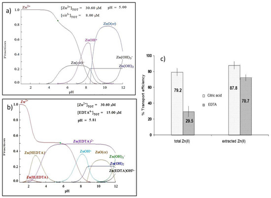 In Figure 5c, the Zn transport efficiencies are represented considering the initial and the extracted Zn(II) concentrations. The latter was calculated after determining the remaining Zn(II) concentration in the donor phase at the end of the experiment. As can be seen, the percentage of the total Zn(II) concentration transported in the presence of citric acid was 79.2%, which corresponds to the percentage of free Zn(II) concentration calculated by the program Medusa in the same chemical conditions (78.9%). However, in the experiments performed with EDTA, the Zn transport efficiency (29.5%) was lower than the free Zn(II) percentage calculated by the software (49.6%). These results point out that in the case of citric acid, all free Zn(II) was transported whereas, in the case of EDTA, only a 59.5% of the calculated free Zn(II) was transported. Zn extraction efficiencies, E%, in the presence of citric acid and EDTA in the donor solution were 87% and 38%, respectively. The comparison of the E% and T% values led us to confirm that the presence of citric acid did not affect both extraction and transport Zn (II) efficiencies and, on the contrary, both processes were affected when EDTA was present, even at small concentrations. Also in Figure 5c, transport efficiencies of the extracted Zn(II) in the donor solution, which was considered to be free Zn(II) ions, are represented. Transport efficiencies of 87.8% and 70.7% were obtained in the presence of citric acid and EDTA, respectively. These values are compared with the percentage of free Zn(II) transport (90%) under the same chemical conditions and without the presence of ligands resulting in a significantly lower value (70.7%) being obtained when EDTA was present in the donor solution. From these results, we can suggest that the presence of strong Zn(II) chelators such as EDTA in the aqueous solution affect the extraction and transport of free Zn(II) through the membrane.