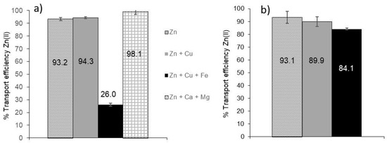 Transport efficiency of Zn(II) in presence of other metals (n = 3). (a) Initial concentrations of Zn(II), Cu(II) and Fe(III): 2 mg L−1; [Ca(II)] = 120 mg L−1 and [Mg(II)] = 40 mg L−1; (b) initial concentrations of Zn(II), Cu(II) and Fe(III): 0.8 mg L−1. In both trials: membrane phase: 0.1 M D2EPHA in dodecane and stripping phase: 600 µL of 0.1 M HNO3.