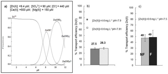 Performance of the HFSLM in natural waters. (a) Species distribution of Zn under the chemical conditions of Osor River water (conductivity: 130.3 µS cm−1; TOC: 3.53 mg C L−1; (b) percentage of Zn(II) transported in two different water samples (n = 3); (c) the effect of filtration in the percentage of Zn transport F: filtrated sample; NF: non-filtrated (n = 3). Membrane phase: 0.1 M D2EPHA in dodecane and stripping phase: 500 µL of 0.1 M HNO3.