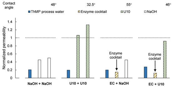 Normalized membrane permeability after fouling with ThMP process water and subsequent two-step cleaning. The water contact angles of the cleaned membrane samples are given above the figure. U10: Ultrasil 10, EC: Enzyme cocktail.
