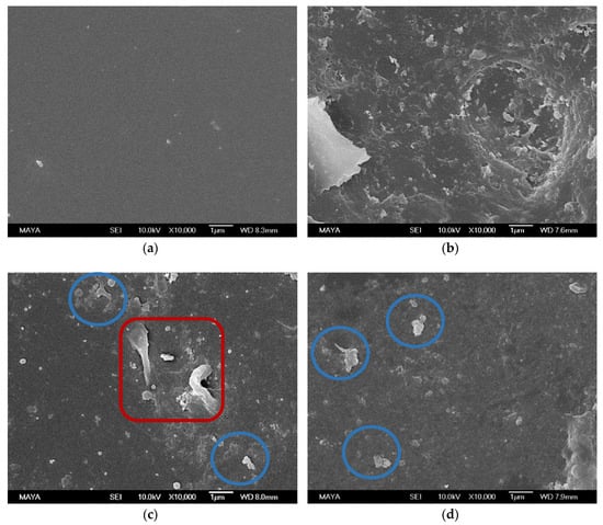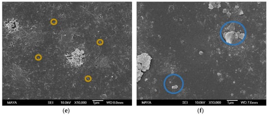 SEM images of membrane samples after: (a) conditioning, (b) fouling with ThMP process water, (c) NaOH + NaOH cleaning, (d) U10 + U10 cleaning, (e) EC + NaOH cleaning, and (f) EC + U10 cleaning. Objects assignment: assumingly extractives (circle in blue), assumingly enzymes (circle in brown), unassigned (red square).