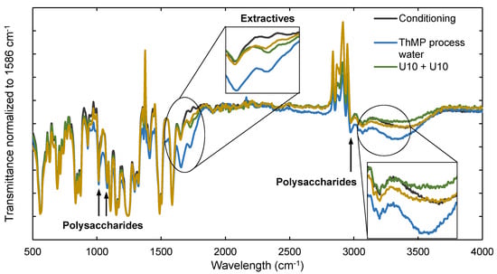 The peak at 1728 cm−1 is associated with the C=O stretching of lipophilic extractives, fatty acids, resin acids, steryl esters, and triglycerides. These compounds have been found previously on membranes used for the filtration of pulp and paper mill process water [19]. It shows that extractives also foul the membrane, in addition to polysaccharides. The transmittance of the cleaned membrane samples at this wavelength is not the same as the transmittance of the conditioned membrane sample. However, it is attenuated for the cleaned membrane in comparison with the transmittance of the fouled membrane sample at 1728 cm−1. It can therefore be concluded that extractives were partly, but not completely, removed from the membrane.