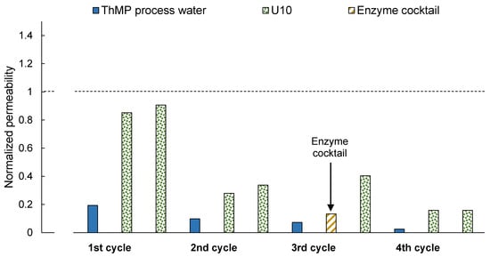 The permeability after the fourth and final filtration and cleaning cycle was low, at 0.16, and indicates that U10 does not remove all the foulants of the membrane (compared to Figure 4, second filtration cycle). However, the lower permeability can also be assigned to aging of the ThMP process water. The experimental setup only allowed the addition of fresh ThMP process water to the remaining solution in the feed tank, instead of the emptying of the tank and subsequently replacement of old with fresh ThMP process water after each filtration cycle. This resulted in an accumulation of old ThMP process water in the tank, the properties of which change over time. Aging of ThMP process water was observed in previous experiments when stored for more than several days at room temperature. In the performed study, an experiment took 1.5 weeks.