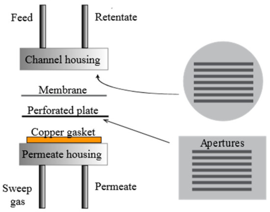 The permeation behavior under pure hydrogen (purity 99.999%) through the Pd77%Ag23% membranes was studied as a function of temperature and pressure with no use of sweep gas. All membranes were mounted in a microchannel configuration as depicted in Figure 1. The membranes were placed in between a polished stainless steel feed housing and a polished stainless steel plate. The feed housing had seven channels for gas flow corresponding to a total active surface area of 0.91 cm2, in accordance with the permeate side steel plate geometry. On the permeate side, an open stainless steel housing was sealed to the perforated steel plate by a polished copper gasket. In conjunction with absence of sweep gas or dilutants, this configuration enables investigation of very thin membranes in absence of transport limitations from the gas phase (concentration polarization) or the support [35]. Membrane leakage was checked by using an Agilent 490 Micro-GC (Agilent Technologies, Santa Clara, CA, USA). No leakage could be detected during any of the permeation experiments both before and after the three-step heat treatment procedure. Experiments were performed at selected temperatures of 300, 350, and 400 °C. 300 °C was reached by ramping at 2 °C per minute with nitrogen (purity 99.999%) flushing on the feed side and argon (purity 99.999%) on the permeate side. After reaching 300 °C, nitrogen and argon were slowly removed from the system and hydrogen introduced. The permeate side was left at atmospheric pressure while a differential pressure of maximum 2 bar was applied on the retentate side. The permeate flow was measured by a bubble flow meter.