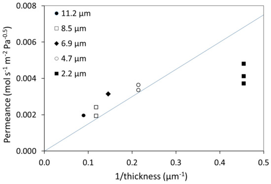 Measured hydrogen permeance as function of inverse thickness at 300 °C for membranes not subjected to HTA. The full line refers to values of permeance reported if bulk is the rate limiting step (1.5 × 10−8·mol·s−1·m−2·Pa−0.5) [5].