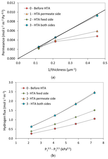 Permeance measured at 300 °C for each single step of heat treatment in air; (a) as function of inverse thickness for the main HTA membrane side sequence with the full line indicating a permeability of 2.1 × 10−8 mol·s−1·m−2·Pa−0.5, and (b) as function of the difference in the square root of the hydrogen partial pressure for the HTA2 membrane side sequence applied to a 2.2 µm thick membrane.
