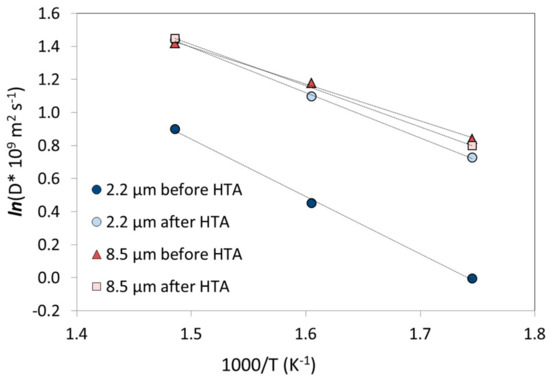 Arrhenius plot of the diffusivity for 2.2 µm and 8.5 µm thick membranes before and after HTA of both sides for the temperature range 300–400 °C. The diffusivity scale is presented in logarithmic form and the dotted lines are linear fits.