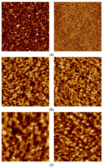 AFM was used in order analyze how the hydrogen stabilization and HTA procedure affects the surface topography of the different membranes. Figure 5 and Figure 6 show representative AFM images of 2.2 µm and 8.5 µm thick as-grown, hydrogen-stabilized, and air-treated membranes. The corresponding roughness values of all the measured membranes are reported in Table 4. The feed/growth side of as-grown samples shows an increase in the surface roughness as the thickness increases. The corresponding permeate/substrate side is very smooth (0.2–0.4 nm) with some variation in surface roughness between the different samples and thicknesses analyzed. This is in accordance with previous results for similar, sputtered membranes [10,29], and reflects the nature of the nucleation and growth phenomena involved during sputtering. A relatively high density of nuclei seem to form on the substrate, and then growth proceeds by continuing some grains while others are terminated [19].
