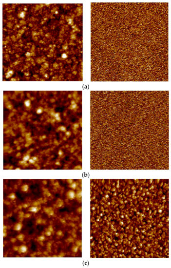 The surface topography was investigated by atomic force microscopy (AFM, Bruker, Boston, MA, USA) using a Multimode AFM instrument with a Veeco Multimode controller. All force spectroscopy analysis was performed in tapping mode under atmospheric conditions. Surface topography was investigated for both growth/feed side and substrate/permeate side for all the as-grown membranes, for hydrogen stabilized membranes and selected membranes after heat treatment in air with subsequent hydrogen stabilization. At least five surface scans were obtained at different locations for each sample. The first flattening order, provided by the AFM-instrument software (Nanoscope Software Version 7.2, by Veeco, Plainview, NY, USA), was performed in order to remove tilt and noise from all images. Surface roughness was estimated as the root mean square roughness (Rq) from the measured AFM images.