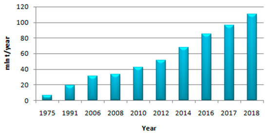 Methanol is currently produced all around the world (over 90 methanol plants facilitate a production capacity of around 110 million tons [3], Figure 2): North and South America, Europe, Asia, and there are also some plants in Africa. Moreover, global methanol consumption is valued at an average of around 100 Mt/year, growing very fast in the last four decades [7,12].
