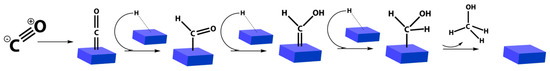 Therefore, a part from the eighth group of the periodic system, many oxide- and metal-based catalysts were used for the hydrogenation reaction, carrying out this process at 250–300 bar and temperatures between 320 and 450 °C. At these operating conditions, the experimental results given by ZnO/Cr2O3 and ZnO/CuO catalysts were particularly interesting [9,22,26,27,28,29]. Based on the aforementioned solid catalysts, two ways were proposed for describing the reaction mechanism, both involving CO and H2 adsorption [30,31,32,33]. Figure 3 illustrates a scheme of the reaction mechanism taking place in four consecutive hydrogenation steps.