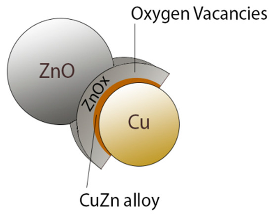 In recent years, ZnO/Cu-based catalysts were the main subject of several scientific studies [27,28,34,35,36,37,38]. The mixture between Cu and ZnO creates small aggregates, in which ZnO is aggregated around Cu, forming a core–shell structure responsible for the selectivity of methanol production. This aggregate is formed partially by Cu, part of the shell comprises a Cu/Zn alloy, and the outermost part of the shell is represented by ZnOx (selective to the formation of methanol), where the vacations of oxygen are located, while another part of the aggregate consists of ZnO (Figure 5).