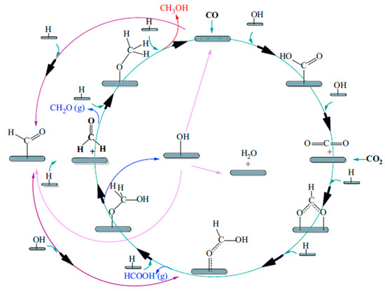 The hard experimental conditions imposed by the BASF process induced strong efforts to realize methanol synthesis at lower pressures. This was achieved by ICI Company (today, Johnson Matthey), which proposed a new methanol synthesis process in the pressure range from 35 to 54 bar and at temperatures from 200 to 300 °C. This goal was also due to the development of new Cu-based catalysts (Cu/ZnO/Al2O3) [28,29,30], but also to the development of new advanced separation/purification processes of synthesis gas, with the advantage of using sulfur–chlorine-free syngas [31,32,33]. However, although Cu/Zn-based catalysts proved to be very efficient in the methanol synthesis process, their wide utilization was negatively affected by their limited lifetime and low thermal stability [34]. These issues were overcome by adding alumina to the catalysts, responsible for the enhancement of catalytic stability, while depleting the Cu crystallites’ thermal formation [34,35,36]. Among several kinds of catalytic systems, Cu/ZnO/Al2O3-based catalysts seem to be the most promising ones. Liao et al. [39] reported significant morphology-dependent Cu–ZnO interactions, while Sun et al. [28] revealed their promotional effects on the catalytic performance of CO2 hydrogenation to methanol. A catalytic cycle is then proposed as a microkinetic model in Figure 7, which shows the scheme of a reaction mechanism where methanol may be generated by CO hydrogenation by means of HCOO, HCOOH, CH2COOH, CH2O, CH3O, or HCO, CH2O, CH3O intermediates [39].