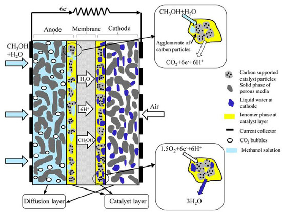A direct methanol fuel cell (DMFC) is classified as a low temperature polymer electrolyte membrane fuel cell supplied by liquid or vapor methanol [58]. Figure 8 shows the schematic diagram of a DMFC, which consists of at least five main porous layers: