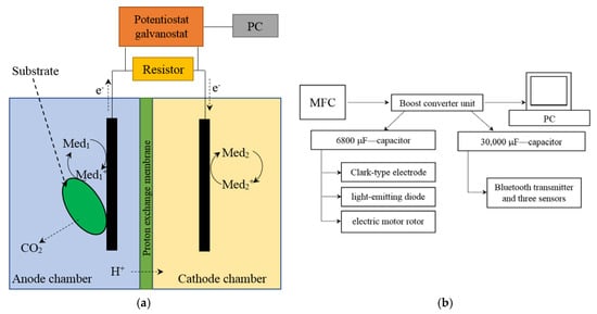The microbial fuel cell was represented by two interconnected cuvettes; the volumes of the anode and cathode chambers were 5 mL. The chambers were separated by an MF-4SK proton-selective membrane (Plastpolimer, St.-Petersburg, Russia), an analogue of the Nafion 117 membrane in a protonated form. The area of the membrane was 1.2 cm2. Interconnected cuvettes, in which the volumes of the anode and cathode chambers were equal to 50 mL, were used for converter accumulation of energy. The area of the proton-selective membrane was 20 cm2. Scheme for the MFC and its external connections is presented in Figure 1a. Block diagram for converter accumulation of energy is presented in Figure 1b.
