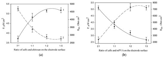 Effect of the ratio of cells and polymer on the anode surface on MFC power (1) and internal resistance (2) (the number of cells on the electrode surface is constant, 0.12 mg/mm2): 1, MFC power; 2, Rin; (a) chitosan; (b) mPVA.