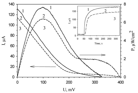 Typical polarization curves obtained from cyclic voltammograms and, calculated based on them, power characteristics of polymer/G. oxydans electrodes: 1, chitosan; 2, mPVA; 3, PVA. Inset: typical signals of polymer/G. oxydans electrodes: 1, chitosan; 2, mPVA; 3, PVA.