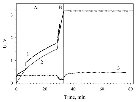 Charging a 6800-μF capacitor from series-connected MWCNT-modified MFCs using a converter unit: 1, charge voltage; 2, voltage across the accumulating capacitance; 3, input voltage coming to the converter. (A), low-efficiency slow charge phase; (B), high-efficiency fast charge phase. Registration of the capacitor total charge after a 48-h continuous operation of the MFCs is shown.