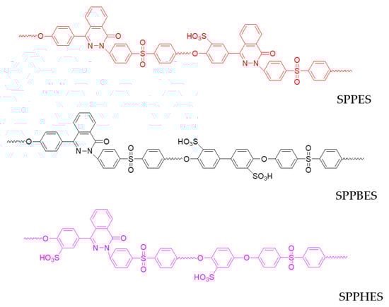 The chemical structure of three sulfonated poly(aryl ether sulfone)s: sulfonated poly(phthalazinone ether sulfone) (SPPES), sulfonated poly(phthalazinone biphenyl ether sulfone) (SPPBES), and sulfonated poly(phthalazinone hydroquinone ether sulfone)s (SPPHES).