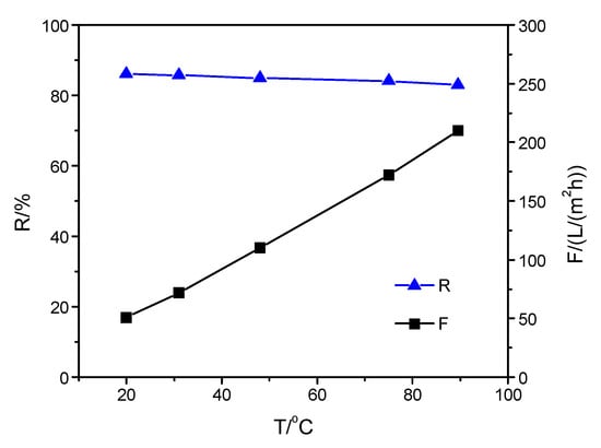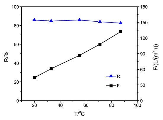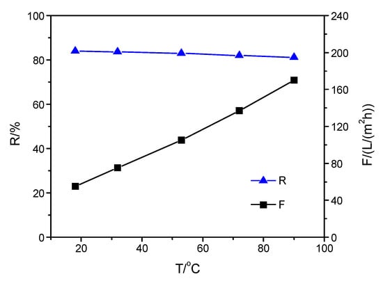 To investigate the thermal stability of membranes, the main method is to evaluate their separation properties under various temperatures of feed solutions. Solute rejection and flux of polymer membranes is related to the mobility of the macromolecular chain. Molecular chains of polymers become more flexible and their shapes became easier to change as solution temperature rises. The molecular chain is more sensitive to temperature, and the membrane pore is more likely to change under hydraulic pressure at an elevated solution temperature [].