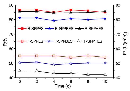 Hamza et al. [] reported that solvents used in preparing the coating solution had a great effect on the performance of composite membranes. To investigate the effect of solvents on the membrane performance, EGME, EGME + acetone (5:1), EGME + DO (4:1), and EGME + ethanol (4:1) were used as the coating solvents to prepare sulfonated poly(aryl ether sulfone) composite membranes. The performance of composite membranes for a 1.0 g/L Na2SO4 feed solution was measured, and the results are shown in Table 4. SPPES composite membrane prepared from EGME + acetone (5:1) as the solvent had the highest Na2SO4 rejection (90%), SPPBES composite membrane fabricated from EGME as the solvent had the highest Na2SO4 rejection (86%), and SPPHES composite membrane prepared from EGME + DO (4:1) as the solvent had the highest Na2SO4 rejection (87%), However, composite membranes prepared from these solvents showed relatively low fluxes. With EGME + ethanol (4:1) as the solvent, the Na2SO4 rejection of SPPES membrane was 88%, and the flux was 55 L/(m2·h), while the SPPHES membrane showed 85% Na2SO4 rejection. With sulfonated poly(aryl ether sulfone) composite membranes prepared with EGME + ethanol (4:1) as the solvent, the composite membranes showed high rejection and flux. The rejection of composite membranes ranged from 81% to 88%, and the flux of composite membranes was in the range of 45–55 L/(m2·h).