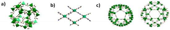 (a) Building blocks of ZIF-8 with ZnN4; (b) pore system in NH2-MIL-53 with AlO6; (c) building blocks of MIL-101 with mesoporous cages; Reproduced with permission from [63].