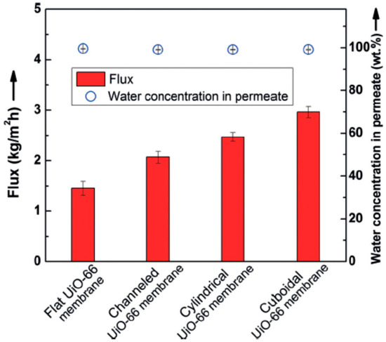 Li et al. [69] applied the micropatterning concept for the first time to MOF membrane with enhanced molecular sieving property, which can used in compact devices. Ultrathin polycrystalline zirconium-MOF UiO-66 membranes with a thickness down to 250 nm on a patterned porous yttria-stabilized zirconia (YSZ) ceramic substrates were grown by a bottom-up procedure. The patterned UiO-66 membranes exhibited good molecular separation property (separation factor of over 1000) and 100% improvement in the apparent permeation flux of 2.96 kg·m−2·h−1 (patterned UiO-66 membranes were considerably higher than the unpatterned membrane, Figure 5) in butanol dehydration through the pervaporation process and showed that growing high-quality MOF thin films (defect-free) on complex surfaces can be achieved in MOF membrane formation.