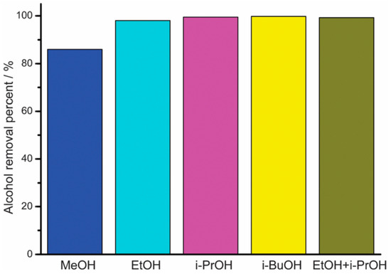 MOFs with linkers of transition metals and imidazolate have porous structure, making them desirable candidates for molecular sieve membranes. The potential to adjust the pore size and surface properties of the ZIF has found its application in the recovery of bio-alcohols by using them as adsorbents. Liu et al. [75] reported the amine aggregate functionalisation on ZIF-90 by covalently connecting with free aldehyde functional groups present in the structure through host–guest interaction. Liu et al. reported the combination of a superhydrophobic ZIF-90 for the purpose of bioalcohol recuperation through the post-functionalization of ZIF-90 with penta-fluorobenzyl amine by means of an amine group. It is generally presumed that the fluorinated ZIF-90 will display a high hydrophobicity and, in this way, it is a promising candidate for bioalcohol recuperation. The reaction between pentaflurobenzylamine and ZIF-90 takes place on the external surface of ZIF-90 through the condensation of amine groups. The surface of the fluorinated ZIF-90 showed a water contact angle of about 152.41; while the contact angle of water on the surface of the as-arranged ZIF-90 is 93.91°, it indicates that the hydrophobicity of the ZIF-90 can be increased through post-functionalization with pentafluorobenzyl amine. About 98% ethanol was removed from the mixture of ethanol/water from the superhydrophobic ZIF-90 (Figure 6). In contrast, only 7% ethanol can be removed while applying as-prepared ZIF-90 as the adsorbent. Besides ethanol, the superhydrophobic ZIF-90 displays high adsorptive separation performances for the other bio-alcohols such as methanol, iso-propanol and butanol, along with its mixtures.