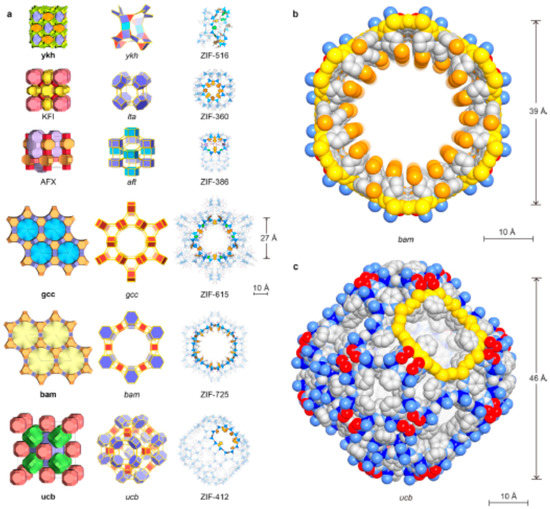 Crystal structures of the new ZIFs. Topologies are shown in natural tilings. The largest cages are presented with adjacent small cages, and characteristic cages are shown with ball-and-stick structures for linkers (N, blue; C, dark; O, red; Cl, green; Br, orange, H, omitted for clarity) and blue tetrahedra for ZnN4 units. (a) KFI, ZIF-360; AFX, ZIF-386; ykh, ZIF-516; gcc, ZIF-615; bam, ZIF-725; ucb, ZIF-412. Largest openings for each cage are highlighted. (b) Space-filling views for the channel in bam ZIF (ZIF-725) are shown (zinc, blue; N, light blue; C, gray; O, red; Br, orange). The 24-MR aperture (bam ZIF-725, 96 atoms) is highlighted in yellow. (c) Space-filling view for the largest cage in ucb ZIFs (illustrated by ZIF-412) is shown: zinc, blue; N, light blue; C, gray; O, red. The 12 MR opening (ucb ZIF-412, 48 atoms) is highlighted in yellow. Reproduced with permission from [7].