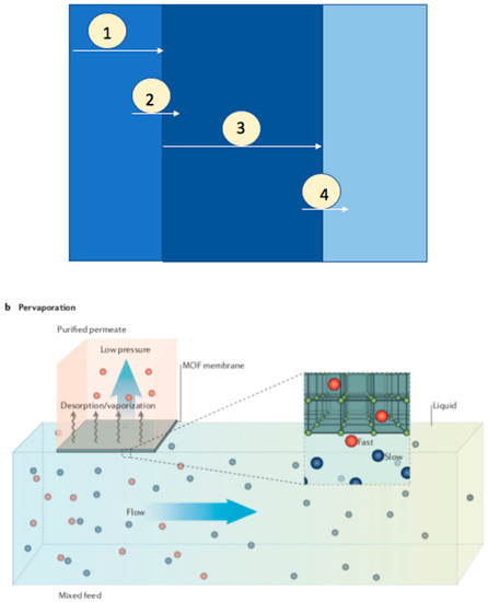 Pervaporation can be used for the separation of liquid mixtures when filtration fails to do so. Sorribas et al. [62] discussed that, in the separation of ethanol/water mixture, HKUST-1 hydrophilic MOF is used in 40 wt% mixed membrane matrices. The incorporation of MOF in the membrane matrix increased the flux by two times and left the selectivity and permeability of water unaltered in the membrane. Su et al. [64] presented a high separation performance of alcohol/water distillation when ZIF-8 nanoparticles were incorporated into PDMS hollow fiber membrane modules. The ZIF-8 nanoparticles enhanced the permeability of both isopropanol and water molecules through the membrane due to high surface area and porosity; this eventually increased the mass transfer efficiency between the phases from 0.95 cm/s to 1.65 cm/s. This membrane displayed higher IPA concentration of 62.2% (mol/mol) with height mass transfer unit (HTU) value of 4.9 cm, when compared with the pure PDMS membrane module.