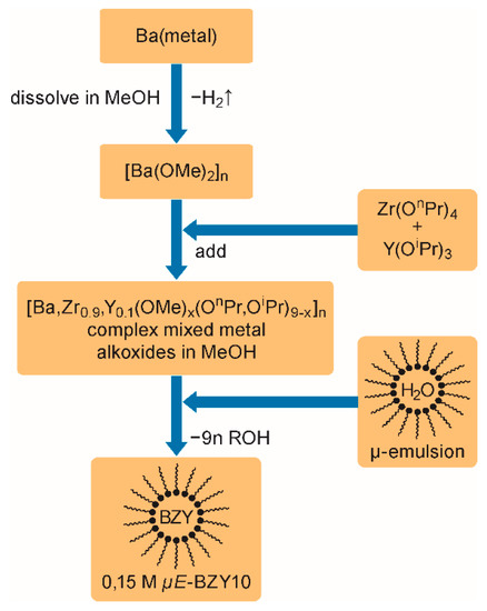 Figure 2 schematically shows the preparation of the µE-BZY10 stock dispersion. The procedure is performed in analogy to earlier work for reverse micelle based barium titanate nanoparticle dispersions [79]. At first, barium metal is dissolved in anhydrous methanol followed by the addition of a Zr/Y n/iso-propoxide mixture in the required 9:1 ratio. The resulting dispersion of complex mixed metal alkoxides is subjected to a quantitative sol-gel reaction within the nanometer sized water droplets of the reversed micelles formed from CTAB (see reference [79]). Finally, a sTable 5 wt% BZY10 nanoparticle containing dispersion corresponding to a concentration of ~0.15 mol L−1 was obtained.
