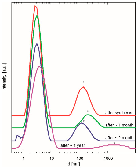 DLS measurements of µE-BZY10 after different times of ageing as indicated. The second peaks marked with asterisks were attributed to apparent agglomerates caused by the concentration.