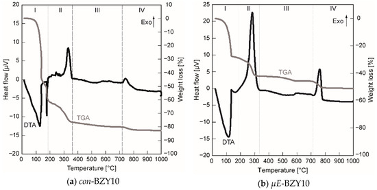 Four regions can be identified in both diagrams (Figure 4). In region I, endothermic evaporation of solvents entrapped in the precursor gels takes place (Figure 4a—n-butanol {b.p. 118 °C} and propionic acid {b.p. 141 °C}; Figure 4b—cyclohexane {b.p. 81 °C} and 1-pentanol {b.p. 138 °C}). Region II corresponds to exothermic decomposition of residual organic material, in region III which corresponds predominantly to the X-ray amorphous metal oxides, no significant reactions and moderate weight losses occurs. Finally, region IV is initiated by the onset of crystallization accompanied with a minor mass loss until the constant weight of the crystalline BZY10 powder is achieved. This final mass loss, 5.3% in case of µE-BZY and 2.3% in case of con-BZY (Figure 4), is attributed to the release of carbon dioxide stemming from the decomposition of residual barium carbonate species during the crystallization process. Anyway, this is only a quite low BaCO3 content compared to a hypothesized situation with an equimolar BaCO3 formation in the amorphous material. Here one would expect a considerably higher weight loss of 13.7% due to the CO2 release.