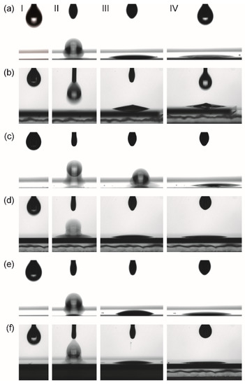Images of characteristic stages (I–IV) of the contact angle measurements extracted from the movie clips recorded from the Drop Shape Analyzer instrument. I: start of experiment; II: impact of the droplet on the surface; III: situation after 1-2 s after impact. IV: just before impact of next droplet. (a) con-BZY and (b) µE-BZY on platinized silicon substrates; (c) con-BZY and (d) µE-BZY on fully BZY10 coated platinized silicon substrates; (e) con-BZY and (f) µE-BZY on oxidized silicon substrates. It should be noted that in the case of con-BZY droplet deposition onto BZY in (c), there is a slight movement of the droplet to the off-axis position. A possible reason for this could be an accidental impurity on the surface at the position of the droplet impact.