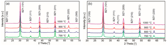 XRDs of BZY10 films derived from the two precursor systems. (a) con-BZY and (b) µE-BZY annealed at different temperatures recorded in grazing incidence. Both films show already the expected reflections for crystalline BZY at 700 °C with cubic indexation. Temperatures and reflex indexes are indicated in the diagrams.