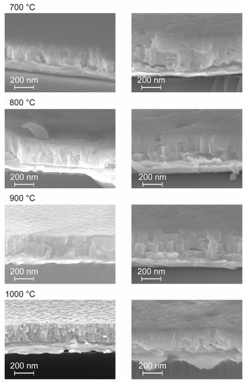 Cross section SEM images from BZY10 films crystallized at different temperatures as indicated. The micrographs shown on the left side stem from five successive coating/annealing cycles of the molecular 0.3 molar con-BZY precursor solution, while the SEM images on the right side were recorded from samples prepared from only three successive coating/annealing cycles of the undiluted µE-BZY dispersion (c = 0.15 mol·L−1).
