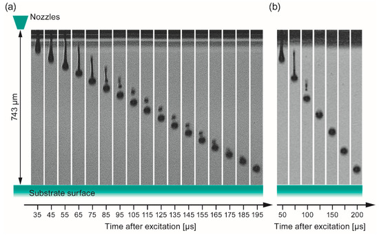 Jetting analysis of the two different inks obtained by dilution of the stock solutions with propionic acid (1:1 vol. ratio) as a function of the elapsed time after triggering the piezoelectric actuator of the nozzle. (a) Ink-1 (c = 0.15 mol/L, derived from con-BZY10); (b) Ink-2 (c = 0.075 mol/L, derived from µE-BZY10). Note, preliminary experiments with methanol as dilution solvent for µE-BZY10 did not lead to a reproducible jetting behavior, most likely due to the combination of a low boiling point (i.e., high vapor pressure) and low surface tension of methanol (22.5 mN/m @ 22 °C).