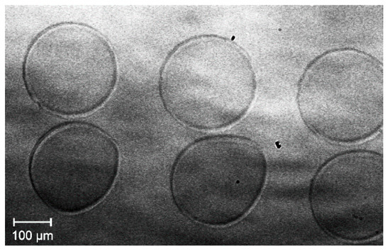From the study of printing individual dots on a substrate in the range of 50 to 200 µm nominal diameter, it turned out that the smallest diameter the print system accepts is 100 µm. Thus, PC generated dots in the diameter range of 100–120 µm (Figure 9), for example, are printed as one single droplet, which expands to 220–230 µm upon impacting the substrate surface due to the good wetting behavior of the applied ink described in Section 3.1.2.