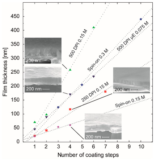 From the analysis of the dotted regression lines in Figure 11, the thickness gain per coating step (nm/#) has been determined to be 27 nm/# (250 DPI), 70 nm/# (500 DPI), and 14 nm/# (Spin-on) for ink-1 (0.15M). For the spin coated 0.3 M stock solution, 46 nm/# was obtained. A calculation of this parameter for ink-2 (0.075M) deposited with a resolution of 500 DPI gave a value of 38 nm/#. Thus, compared to spin-on deposition, the inkjet process enables the same film thickness from the same concentration with a significantly lower number of coating/annealing cycles, which may be an additional benefit of this technique.