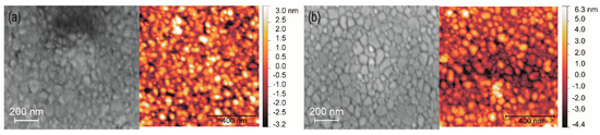 From the XRD data, the crystallite sizes of the two different BZY10 films were estimated using the Scherrer formula with the shape factor of spheres (K = 0.89). The required FWHM (full width at half maximum) values were obtained from the PANalytical program “X’Pert High Score” and crystallite sizes of 42 nm for the BZYink-1 and 44 nm for the BZYink-2 film were calculated. They are in good agreement with the estimated value of ~50 nm obtained from the top view SEM and AFM images (Figure 12). Both surfaces show similar grains and from the comparison of the two SEM images in Figure 12 one may deduce a slightly lower density and higher roughness of the BZYink-2 film, which is confirmed by the RMS values obtained from the corresponding AFM measurements (Figure 12a right image: 1.3 nm RMS, Figure 12b right image: 1.8 nm).