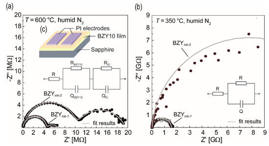 At 600 °C, both films show two semicircles in the impedance spectra, which could be fitted by an equivalent circuit consisting of a series connection of R and two RQ elements (Figure 13a). Q represent constant phase elements and R the resistance. The resistance R was added to the model to consider a possible contribution of the Pt contact wiring. For the high frequency semicircles, Q values in the pF range (~1.7 pF/ink-1, ~4 pF/ink-2) have been observed. As reported in the literature for the case of in-plane EIS measurements of thin electrolyte films grown on substrates such as sapphire [98,99], it can typically not be differentiated between grain and grain boundary contributions due to the influence of the stray capacitances. Thus, this semicircle is attributed to the total electrolyte film response (RBZY10QBZY10), i.e., combined bulk and grain boundaries. The second, low frequency semicircle is typically attributed to the electrode polarization and may also stem in the present work from the electrodes (RElQEl) although the Q values (~38 nF/ink-1, ~3 nF/ink-2) are not in the typical range (~10−6 F). When decreasing the temperature, this low frequency contribution increasingly vanishes below 400 °C, meaning only one high frequency semicircle remains visible (cf. Figure 13b). Hence, it is concluded that the only information which can be gathered from EIS in the present study is the resistance of the corresponding BZY10 film. From the resistance data (RBZY10) and the geometry of the samples, the total conductivities σ were calculated according to: