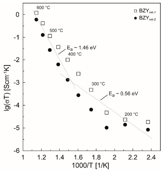 with D relating to the distance between the two Pt electrodes and A corresponding to the area obtained from the length of the electrodes times the corresponding film thickness d. For the two exemplary temperatures conductivities of σ = 4.0 × 10−6 S/cm (350 °C) and σ = 1.3 × 10−3 S/cm (600 °C) for BZYink-1, and σ = 4.5 × 10−7 S/cm (350 °C) and σ = 6.9 × 10−4 S/cm (600 °C) for BZYink-2 have been obtained by applying Equation (4). These values are in a comparable range to other polycrystalline films described in the literature, e.g., ~10−6 S/cm at 350 °C and ~ 1.6 × 10−4 S/cm at 600 °C (d = 6 µm) reference [22], or ~4.6 × 10−4 S/cm at 600°C (d = 480 nm) thick reference [35] which, however, have been prepared by PLD.