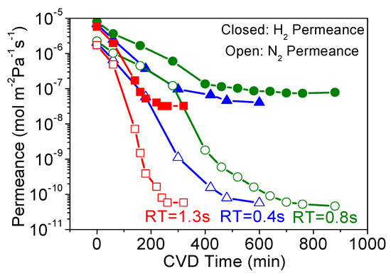 Here, the MTMOS membrane fabrication is shown as an example, and Figure 2 shows the changes in H2 and N2 permeances during MTMOS deposition for three different RTs (0.4 s, 0.8 s, and 1.3 s). Although the final N2 permeance did not vary significantly, the required CVD time was significantly different for each retention time and there was no trend in the results, and this can be explained by a tradeoff between different factors. These factors are residence time (flow rate) and total reaction time. Normally, short residence times require longer CVD times, because the high flows carry away the reactant and more time is needed to plug the pores. Conversely, high residence times require shorter CVD times as there is more opportunity for reaction. However, with short residence times and high flows, the diffusion boundary layers are smaller and the reactant is quickly replenished. This enhances mass transfer and allows for shorter CVD times to suffice. Of course, the opposite holds for high residence times, meaning there is a tradeoff between macroscopic reactant supply and microscopic mass transfer.