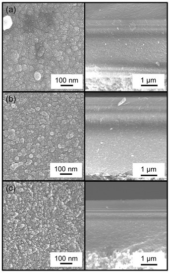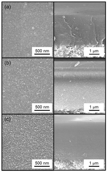 Surface (left) and cross-sectional (right) SEM images of the MTMOS-derived membranes deposited with residence times of (a) 0.4 s, (b) 0.8 s, and (c) 1.3 s.