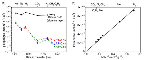(a) Gas permeances at 300 °C of the MTMOS-derived membranes deposited at 650 °C with residence times of 0.4 s, 0.8 s, and 1.3 s. (b) Gas permeances at 300 °C through the alumina layer before CVD showing Knudsen selectivity.