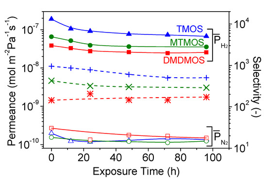 The hydrothermal stability was tested for the three membranes, and the results are shown in Figure 9. Under hydrothermal conditions, the H2 and N2 permeance decreased during the 96-h exposure, with the largest permeance changes occurring in the first 24 h. After that, the H2 permeance continued to decrease gradually, while the N2 permeances appeared stable (Table 4). Importantly, the decrease in H2 permeance was inversely proportional to the presence of methyl groups; the decrease was highest for the TMOS-derived membrane and lowest for the DMDMOS-derived membrane.